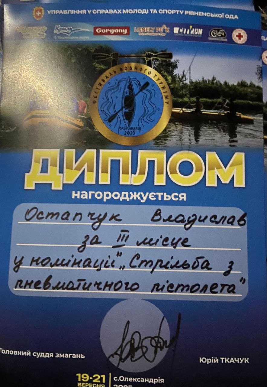 🎉 Вітаємо команду “Руді шуліки” у складі ОСТАПЧУКА Владислава, ВОЛКОВСЬКОЇ Анастасії, БОЦЛАН Адріани, ВОЛКОВСЬКОЇ Марії, за здобуте І місце на дистанції “Слалом”, ІІ місце на дистанції “Спринт”. ОСТАПЧУКА Владислава за ІІІ місце у номінації “Стрільба з пневматичного пістолета” – вихованців гуртка “Спортивне орієнтування” при ОЗ”Жобринський ліцей”Клеванської селищної ради (Керівник ПОПНЮК Микола).