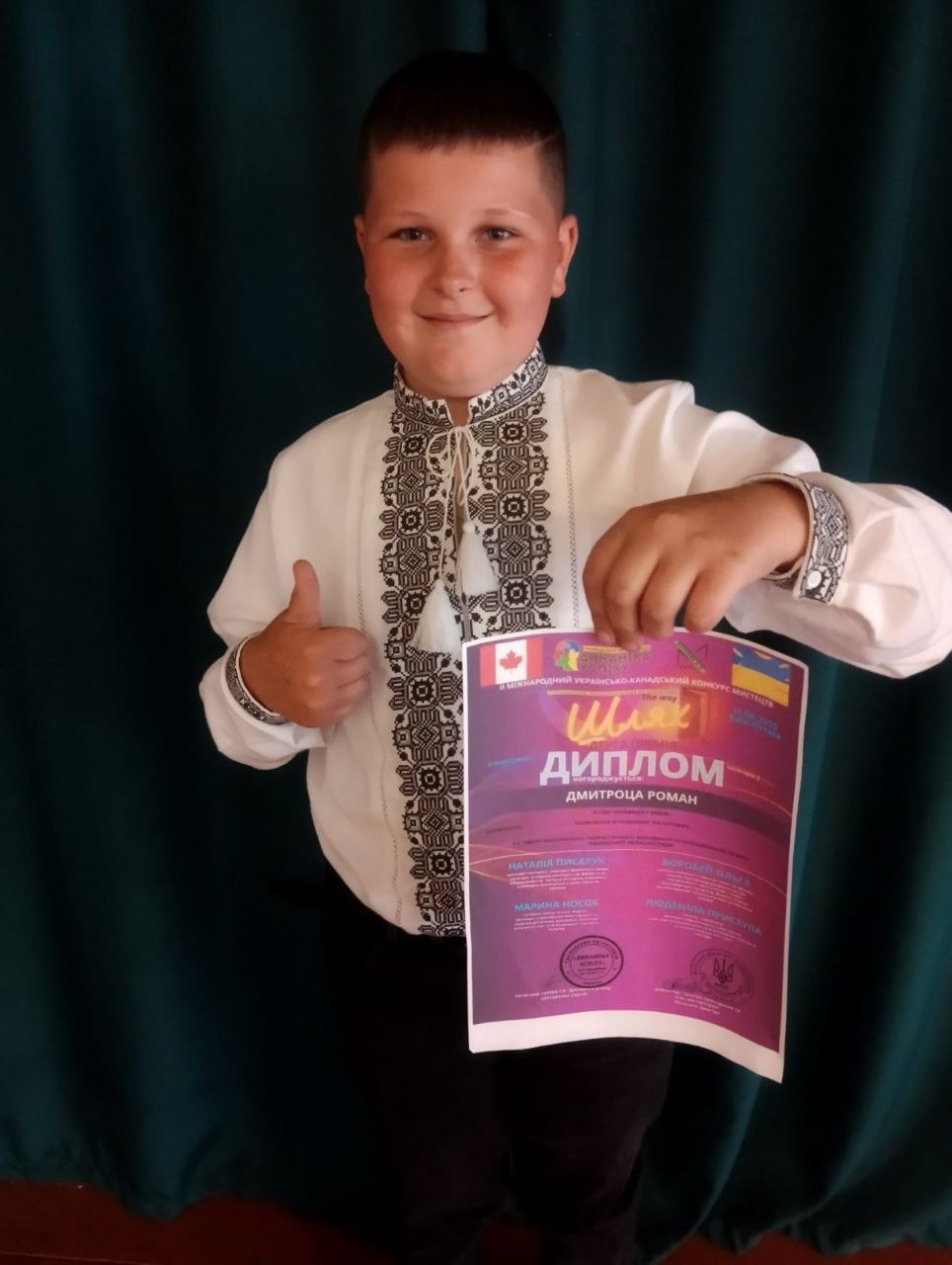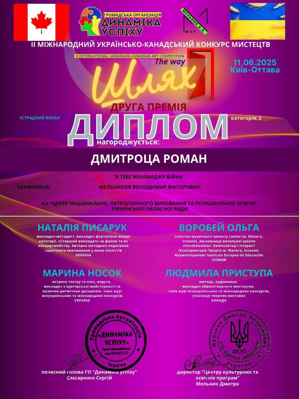 - Роман ДМИТРОЦА отримав другу премію в ІІ МІЖНАРОДНОМУ УКРАЇНСЬКО-КАНАДСЬКОМУ КОНКУРСІ МИСТЕЦТВ “ШЛЯХ” вихованець гуртка “Вокальне мистецтво” під керівництвом Володимира МЕЛЬНИКОВА