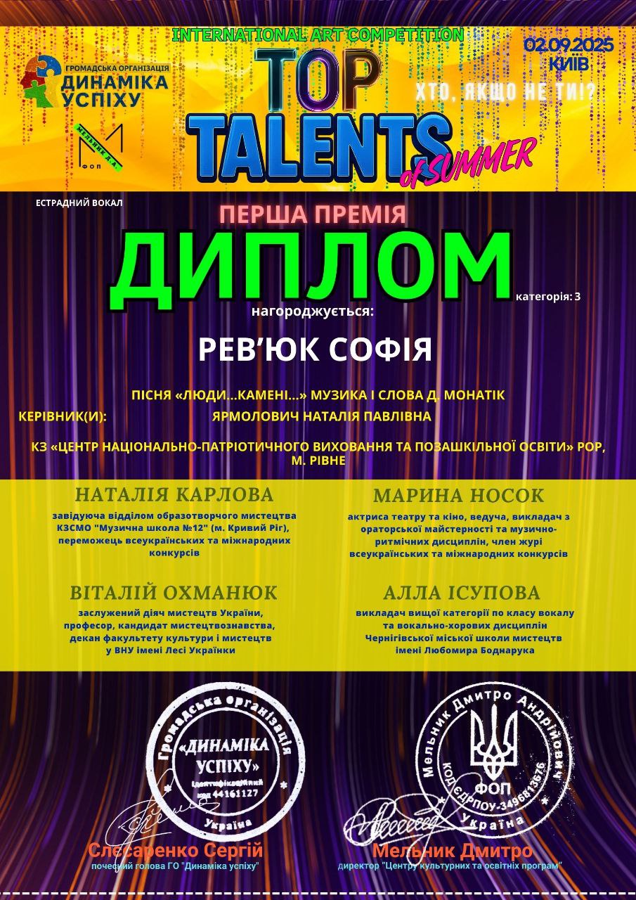 - Софія РЕВ’ЮК отримала першу премію в конкурсі INTERNATIONAL ART COMPETITION “TOP TALENTS of SUMMER”, вона є вихованкою гуртка “Естрадне мистецтво” що базі Острозького ліцею №2 під керівництвом ЯРМОЛОВИЧ Наталії