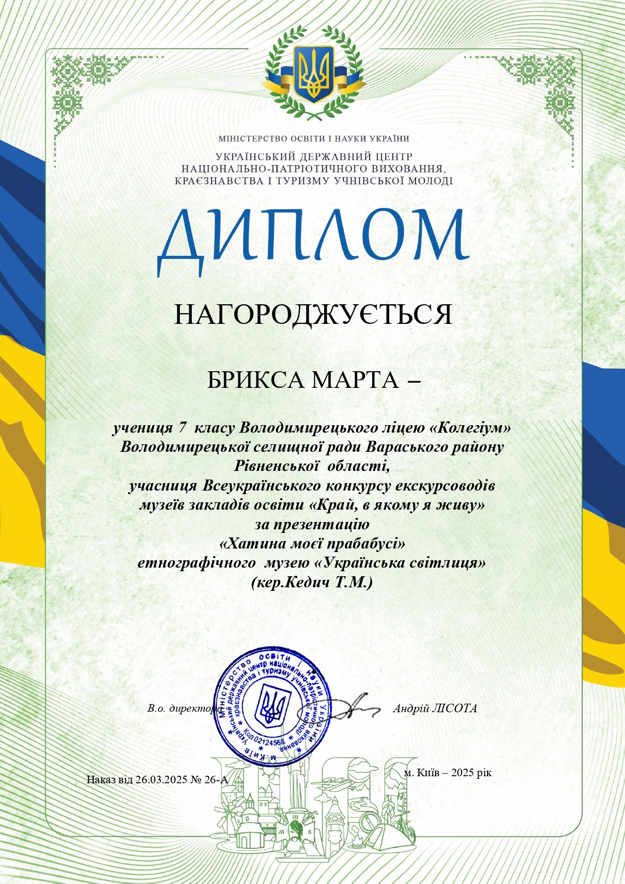 • Брикса Марта, екскурсовод музею Володимирецького ліцею «Колегіум» (керівник – Тетяна Кедич) – гідно виступила в секції етнографічних музеїв, продемонструвавши високий рівень підготовки.