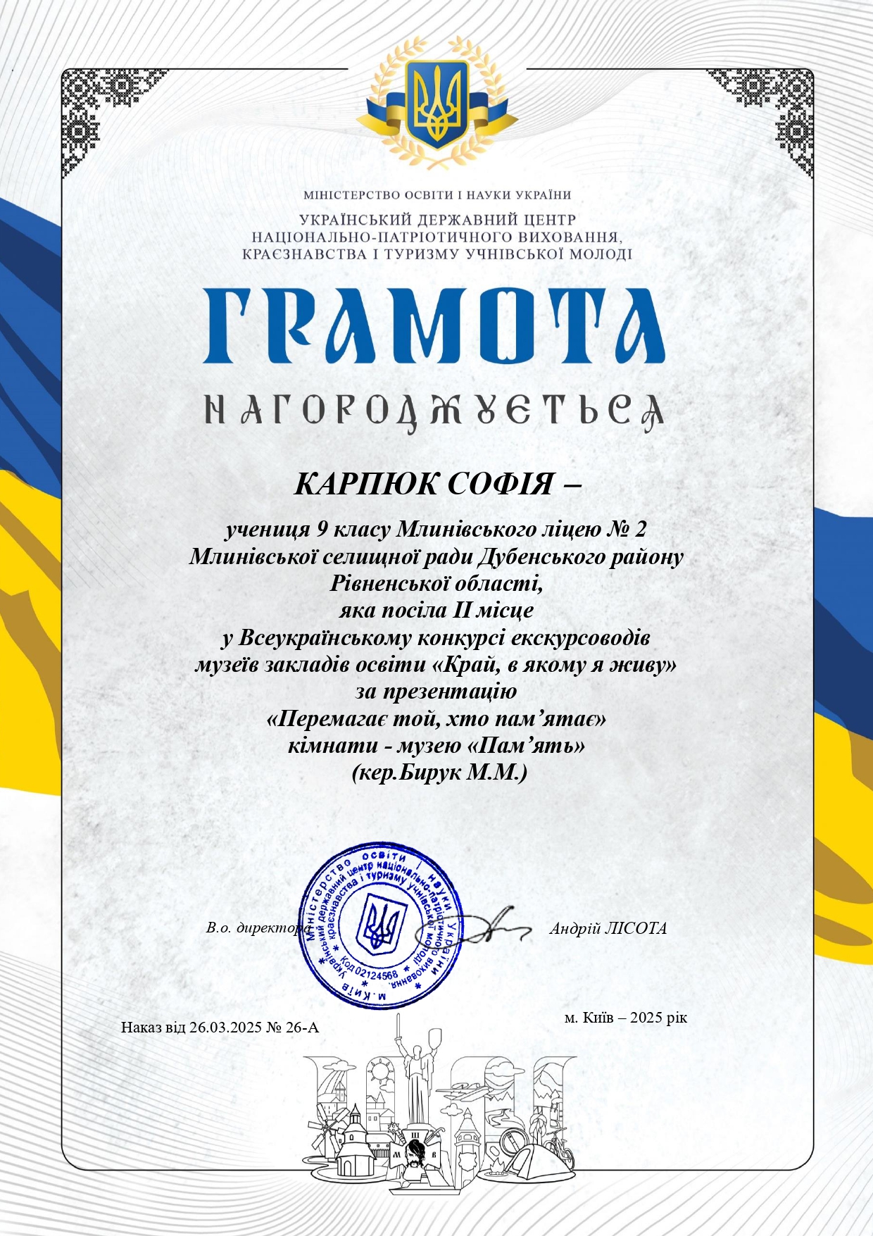 • Карпюк Софія, екскурсовод музею «Пам’ять» Млинівського ліцею № 2 (керівник – Микола Бирюк) – здобула ІІ місце серед музеїв військово-історичного профілю;
