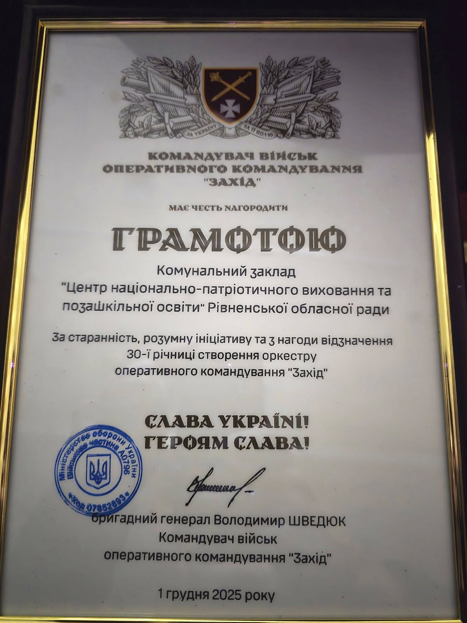 Під час урочистостей грамотою командувача військ оперативного командування “Захід” відзначили колектив КЗ “Центр національно-патріотичного виховання та позашкільної освіти” РОР. Також Подякою за вклад у розвиток позашкільної освіти Рівненщини закладу було нагороджено диригента оркестру, підполковника Ярослав Король.